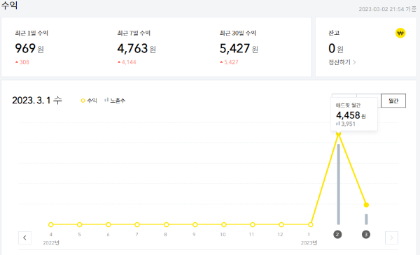 제가 2월 15일 정도에 에드핏을 시작했는데 그러면 14일 동안 광고 수익이 4,458원이 되겠네요. ㅎㅎ